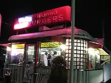 The White Mana, located at 470 Tonnele Avenue (40°44′50″N 74°3′42″W)[2] in the Western Slope neighborhood of Jersey City was the first White Manna to open, and consists of the original 1939 World's Fair building.[5] When originally introduced, it was called the "diner of the future" and an "Introduction to Fast Food."[2] According to the present owner, Mario Costa, Jr., the difference in spelling was the result of an error when the sign was serviced.[6] It is famous for its hamburgers and sells approximately 3,000 a week.[7]