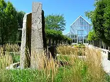 Dale Enochs contributed several pieces, including seven water tables, 40 sculptural stones, and 100 individual limestone bricks. Enochs' Earth Stone, a 12-foot (3.7 m)-tall limestone sculpture, serves as a focal point in the outdoor gardens.