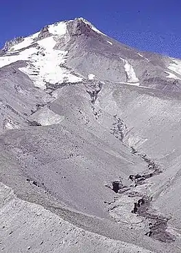 White River Glacier is an alpine glacier located on the south slopes of Mount Hood in the U.S. state of Oregon.[2] It ranges in elevation from about 10,000 to 6,200 feet (3,000 to 1,900 m). It is among the best known of the twelve glaciers on the mountain, and the lower reaches are a popular destination for Nordic skiing enthusiasts. The glacier is the source of the White River, a tributary of the Deschutes River, and has a long history of washing out the bridge where Oregon Route 35 crosses at 45.30307°N 121.67208°W.