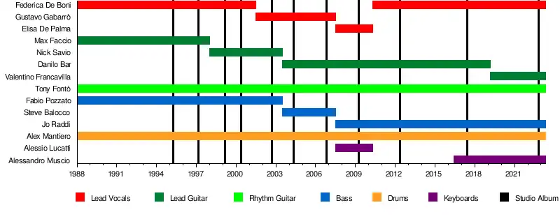 The line-up of the band did not change until 1998 when Nick Savio replaced Max Faccio. In 2001, female lead singer Federica de Boni left the band and was replaced by a male lead singer Gustavo Gabarro. Two years later, Fabio Pozzato and Massimo Faccio left the band as well. In 2007, Elisa de Palma became the new singer, with the band becoming female-fronted once again. In 2010, de Boni rejoined the band.