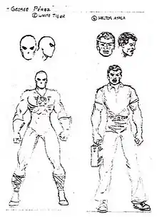 When the decision to make the White Tiger the main character of Deadly Hands of Kung Fu, with the Sons of the Tigers as supporting characters, Bill Mantlo intended to adequately depict the “gritty/city slums” of New York City.[2] Believing that, due to being Puerto Rican, George Pérez had “intimate knowledge” of the daily life in the South Bronx during the 1970s, he approached the artist with a proposal to create a “character that reflects that grim reality”.[2] Due to the monochromatic style of Deadly Hands of Kung Fu, the initial concept for White Tiger’s costume was simply Spider-Man’s suit “without any detail”.[2] With this idea, Pérez designed the visual aspect of the character, to the satisfaction of both as it was considered elegant and worked well within the constraints of the palette.[2]