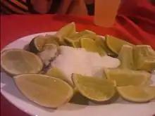 Outside Mexico, a single shot of tequila is often served with salt and a slice of lime or lemon. This is called tequila cruda and is sometimes referred to as "training wheels", "lick-sip-suck", or "lick-shoot-suck" (referring to the way in which the combination of ingredients is imbibed). The drinkers moisten the back of their hands below the index finger (usually by licking) and pour on the salt. Then the salt is licked off the hand, the tequila is drunk, and the fruit slice is quickly bitten. Groups of drinkers often do this simultaneously. Drinking tequila in this way is often erroneously called a Tequila Slammer,[52] which is in fact a mix of tequila and carbonated drink. Though the traditional Mexican shot is tequila by itself, lime is the fruit of choice when a chaser must be used.[53] The salt is believed to lessen the "burn" of the tequila and the sour fruit balances and enhances the flavor. In Germany and some other countries, tequila oro (gold) is often consumed with cinnamon on a slice of orange after, while tequila blanco (white) is consumed with salt and lime.