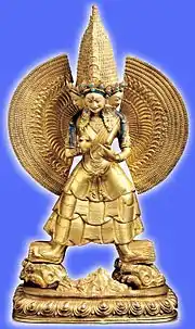 Sitātapatrā is one of the most complex Vajrayana goddesses.[4] According to Miranda Shaw in the Buddhist Goddesses of India, Sitātapatrā emerged from Buddha's uṣṇīṣa when he was in the Trāyastriṃśa heaven. The Buddha announced her role to "cut asunder completely all malignant demons, to cut asunder all the spells of others...to turn aside all enemies and dangers and hatred." Sitātapatrā's benign and beautiful form belies her ferocity as she is a "fierce, terrifying goddess, garlanded by flames, a pulverizer of enemies and demons."[5]