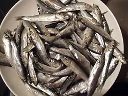 In Japan, the whitebait (しらす/白子, shirasu)[lower-alpha 1] fishing industry is concentrated in Shizuoka Prefecture, where the major landing ports for them are situated.[4] The shirasu boiled in salted hot water is called kamaage shirasu (釜上げしらす, boiled whitebait), and this product retains about 85% or greater water ratio.[5][6]