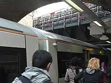 Whitechapel station has bilingual station signage, owing to the large Bengali community in the local area. In March 2022, station signs on the platforms bear "Whitechapel" and also "হোয়াইটচ্যাপেল" in Bengali.[28] It is one of the relatively few stations in England to have bilingual signage, others being Southall (Punjabi), Wallsend (Latin), Hereford (Welsh), Moreton-in-Marsh (Japanese) and St Pancras International, Ebbsfleet International and Ashford International (all French). Mayor of London Sadiq Khan stated that he was "delighted" that the signage was installed ahead of Bangladesh Independence Day on 26 March.[28] The installation was applauded by not only Bangladeshi diplomats, but also Mamata Banerjee, the Chief Minister of West Bengal.[29]