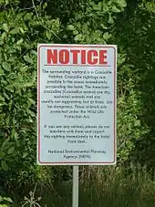 The salt marshes are subject to environmental protection orders. Many birds are regularly seen along the beach, and a notice alerts one to crocodiles.