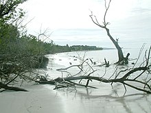 Outside the 1 kilometre (0.62 mi) of maintained beach a narrower, tree-lined strip continues for many kilometres. The trees were badly damaged by Hurricane Ivan in 2004, and the dead tree trunks and stumps still bear witness to the storm's power.