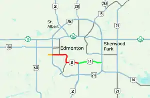 ![]() Whitemud Drive traverses south Edmonton, signed as Highway 14 in southeast Edmonton (highlighted in green), as Highway 2 between Calgary Trail and Anthony Henday Drive (highlighted in red), and unsigned west of Henday (highlighted in orange) | |