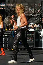 Murray and Dunbar had stopped receiving their wages in April 1986, at which point Dunbar immediately left Whitesnake. Murray was still officially a member of the group until January 1987, when he heard Coverdale was putting together a new line-up.[132][133] With the help of John Kalodner, Coverdale recruited Adrian Vandenberg and Tommy Aldridge, as well as guitarist Vivian Campbell (formerly of Dio) and bassist Rudy Sarzo (formerly of Quiet Riot).[68][134][135] This new line-up would appear in all the promotional materials for the forthcoming album.[136] Whitesnake also adopted a new look, akin to glam metal bands of the time, in order to appeal more to American audiences. When asked about the band's makeover, Coverdale responded: "I'm competing with people like Jon Bon Jovi. I've gotta look the part."[137]
