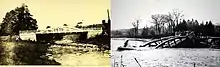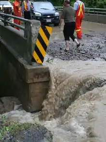 The Whitevale Bridge has suffered from at least three separate occasions of flooding. In 1929 a heavy flood completely washed out the newly built bridge. In October 1954, the mill dam and the approach to the Whitevale Bridge (not the entire bridge) went out due to Hurricane Hazel when Duffins Creek overflowed.[12] Finally, in July 2008 the concrete bridge suffered minor damage when heavy rains washed out a small section. The previous bridge was demolished in 2014 and replaced by the current structure.