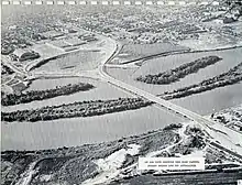 Bids for the entire $12 million construction project were solicited on May 23, 1952.[25] The Arlington, Virginia, firm of J.A. LaPorte Inc. won the dredging contract, and the D.C. firm of Morauer & Hartzell won the fill contract.[26] The work was expected to take 15 months.[26] The NCPPC approved the city's plans to connect the new bridge to Kenilworth Avenue NE on December 13, 1952,[27] and a $5.5 million plan to widen Kenwilworth Avenue into a divided, 10-lane freeway on March 24, 1953.[28] D.C. officials paid $250,000 to buy the land for the exit ramps onto Kenilworth Avenue.[29] Construction on the western approaches was blocked for a month after residents of Suitland, Maryland, (upset by loud trucks passing down their streets) won a month-long restraining order against the project so that contractors could devise and implement a noise-abatement program.[30]