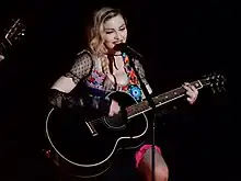 An acoustic rendition of "Who's That Girl", complete with "call-and-response exchanges" with the audience, was done on the singer's Rebel Heart Tour.[74] The number featured Day of the Dead iconography and found Madonna playing guitar;[75][76] after finishing the song, she said: "I'm still trying to figure out who I am after all these years [...] Does anyone ever really know?".[77] For Rollling Stone's Rob Sheffield, "Who's That Girl" was the evening's "emotional highlight".[78]