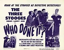 Who Done It? is a 1949 short subject directed by Edward Bernds starring American slapstick comedy team The Three Stooges (Moe Howard, Larry Fine and Shemp Howard). It is the 114th entry in the series released by Columbia Pictures starring the comedians, who released 190 shorts for the studio between 1934 and 1959.