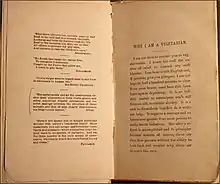 The preface for Why I Am a Vegetarian begins with an analogy of mankind's succeeding generations, in that "the human race is like a snake—it sheds. Ever and anon, as the ages bloom, old forms of thought are superseded by intellectual bran-news."[4] The following page, opposite the opening, are excerpts from several works, including the Irish novelist and poet Oliver Goldsmith's The Hermit, as well as an anonymous poem "What more advance can mortals make in sin?..." It also contains quotes from the British surgeon and polymath Sir Henry Thompson, the Scottish born geologist and natural scientist Richard Owen, and the Greek biographer and essayist Plutarch.[19]