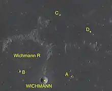 By convention these features are identified on lunar maps by placing the letter on the side of the crater midpoint that is closest to Wichmann.