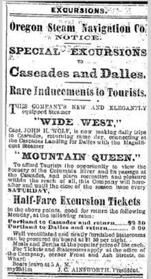 Wide West ran for several years on the Portland-Cascades route, occasionally going to Astoria.[4] Passengers disembarked, and all freight was offloaded at the Cascades, to be taken by a portage railroad around the rapids of the Cascades, to another steamboat, which would proceed to The Dalles, Oregon, where the process would be repeated to bypass the long stretch of rapids above that point on the river.[2][3] When first built, the Daily Astorian criticized O.S.N. for not placing the boat on the Astoria route.
