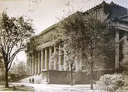 At Harvard's "geographical and intellectual heart" [37] directly across Tercentenary Theatre from Memorial Church,[38] Widener Library is a hollow rectangle of "Harvard brick with Indiana limestone traceries",[39] 250 by 200 by 80 feet high (76 by 61 by 24 m)[31]: 167 and enclosing 320,000 square feet (30,000 m2)[37], "colonnaded on its front by immense pillars with elaborate [Corinthian capitals],[40]: 362 all of which stand at the head of a flight of stairs that would not disgrace the capitol in Washington." [31] Sources describe the building's style as (variously) Beaux-Arts,[20]: 88 Georgian,[41]: 57 [42]: 457 Hellenistic,[43]: 281 or "the austere, formalistic Imperial [or 'Imperial and Classical'] style displayed in the Law School's Langdell Hall and the Medical School Quadrangle".[40]: 361
