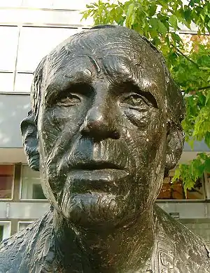 By his second year Förster was already establishing contacts with representatives of the officially forbidden "classical modern" art movement. By this time the division of Germany agreed between the Americans and the Soviets at Yalta at the beginning of 1945 had crystallised into a permanent frontier, but the border between the two Germanies was still relatively porous, especially between West Berlin and the surrounding territories governed as East Germany, and Förster took the opportunity to visit Bernhard Heiliger in the west. Walter Arnold, himself a consummate hands-on craftsman, helped a few of his students, whom he regarded as politically reliable, to deepen their understanding on the essential elements in figurative sculpture, by gaining experience with the works of the westerners Hermann Haller and Charles Despiau.[4] In his third year, required to produce a "portrait from a 'photo", Förster chose as his subject Bertolt Brecht, a long-standing icon of the German intellectual left but nevertheless at this stage ostracised by the authorities. In order to accomplish his course objective he was permitted, a few weeks before Brecht's death in 1956, to attend a rehearsal of Life of Galileo, being staged by the Berliner Ensemble (theatre company).[7]