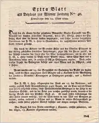 ![]() The Wiener Zeitung Extra of 21 May 1799 reporting on battles between Austrian and French troops in Switzerland | |
