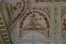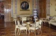 The most impressive surviving rooms of the Palace are on the 1st floor in the left wing. Here is the Red Salon, with walls covered in red silk wallpaper between stucco marble. The room has elaborate ceiling decoration, parquet floors, and paintings in the romantic style. This room connects to the Yellow Salon, the former breakfast room. It is in a similar design to the Red Salon, except the furniture is gold-plated and the wall treatments are in yellow. An adjoining small hall extends over two floors. These walls are decorated with Roman dancers, for which the young architect Philipp Hoffmann dedicated half a year from drawings he had made on site in Pompeii. There is also a buffet room with a seating arrangement in the Louis XVI style.[6][14]