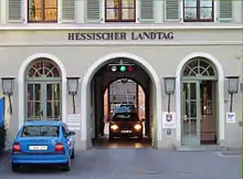 In 1946, Wiesbaden became the capital of the newly created State of Hesse and the Palace became the seat of the Hessian Landtag. The Landtag met for the first time in the largest room of the House, the Music Hall, on 1 December 1946. In 1959 the former Royal Riding Hall in the courtyard was demolished and a new Plenary Chamber built in its place. The Palace's historic rooms were preserved and used for receptions. Ancillary buildings around the Palace were redeveloped for use by the Landtag administration.[2] In 1975 the editorial staff of Hessian Radio (German: Hessischer Rundfunk) moved into the complex to better cover State politics and also opened a TV studio there.[11]