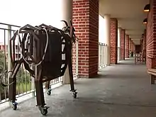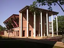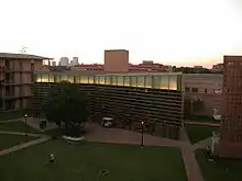 Wiess Hall was completed in 1949, but carried the name "North Hall" until its dedication in March 1950.[44] It was laid out as a W-shaped building, with three north–south wings, joined on the north ends by a long east–west spine, forming two open quadrangles.[45] The building was two stories high except for the three-story center wing. The hall was designed to house about 200 students in 20 single and 90 double rooms. Each room at Wiess opened directly to an exterior walkway that wrapped around the entire building. This design incorporated two features that were innovative at the time: every room had a semi-private bathroom and every room (except room 228, which was reserved for freshmen) had windows on at least two sides—an important adaptation in the years before air conditioning.[46]