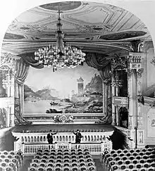 Twenty-four years after it opened, in 1870, Wieting had the building renamed the Wieting Opera House as part of a series of renovations. The building opened under its new name on September 19, 1870.[7] It had a seating capacity of 1,017,[lower-alpha 1] and, despite its name, did not have a true opera performance until an 1886 performance by the American Opera Company. Foster Hirsch notes that opera was "not intended to be the theatre's staple" and the name merely offered a "respectable cover".[20] In 1878 the hall hosted a convention of the National Liberal League.[21] One of the last performances was Sarah Bernhardt, who appeared in March 1881 in Camille.[1] The opera house caught fire on July 19, 1881, and was again burnt to the ground. Losses from the fire were estimated at $400,000, and it was again rebuilt,[5][22] with the purchase of additional land.[2] The new opera house was the first building in Syracuse to have incandescent lighting.[23] It opened on September 18, 1883.[2][14] Upon Wieting's death in 1888, his wife, Mary Elizabeth Wieting, inherited his estate and began managing the opera house.[24]