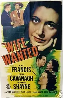 Wife Wanted is a 1946 American crime film directed by Phil Karlson, and starring Kay Francis, Paul Cavanagh, and Robert Shayne. The film's screenplay was written by Caryl Coleman and Sidney Sutherland, based on the novel Wife Wanted by Robert E. Callahan.[1]