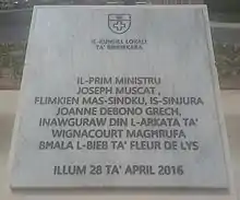 (meaning Birkirkara Local Council. Prime Minister Joseph Muscat, together with the mayor, Mrs. Joanne Debono Grech, inaugurated the Wignacourt Arch known as the Fleur-De-Lys Gate, today 28 April 2016)