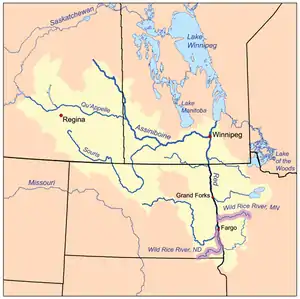 ![]() The Red River drainage basin, with both Wild Rice rivers highlighted | |