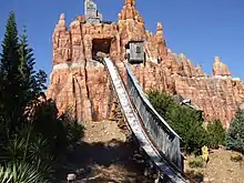 The first section of the ride is slow water channel the weaves its way towards the first lift hill. At the top of the lift hill riders are slowly rotated on a turntable. The 2 bandits shoot the machine until a surprise backwards drop takes riders into a faster section of whitewater rapids. This heavily themed section includes an Indian settlement, a wild-west ghost town and a graveyard, before taking guests into the Rio Bravo mine.[8][9] The boat ascends the second lift hill to the top of the mine. A distressed miner warns the riders to escape before the mine explodes. A second turntable rotates riders to face the final drop. As the doors open the raft is slowly pushed out of the mine and down the drop.[8] Riders can reach speeds of up to 70 kilometres per hour (43 mph) as they descend the 20-metre (66 ft) drop.[1] An on-ride photo is taken of the riders near the top of the final drop.[8] A turn to the left takes the riders into the unloading station. Riders exit via the Rio Bravo shop where ride photos are displayed.