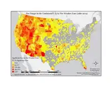 Nationally, the burden of wildfires is disproportionally heavily distributed in the southern and western regions. The Geographic Area Coordinating Group (GACG)[12] divides the United States and Alaska into 11 geographic areas for the purpose of emergency incident management. One particular area of focus is wildland fires. A national assessment of wildfire risk in the United States based on GACG identified regions (with the slight modification of combining Southern and Northern California, and the West and East Basin); indicate that California (50.22% risk) and the Southern Area (15.53% risk) are the geographic areas with the highest wildfire risk.[13] The western areas of the nation are experiencing an expansion of human development into and beyond what is called the wildland-urban interface (WUI). When wildfires inevitably occur in these fire-prone areas, often communities are threatened due to their proximity to fire-prone forest.[14] The south is one of the fastest growing regions with 88 million acres classified as WUI. The south consistently has the highest number of wildfires per year. More than 50,000 communities are estimated to be at high to very high risk of wildfire damage. These statistics are greatly attributable to the South's year-round fire season.[15]