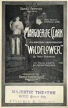 Wildflower was a 1914 American silent romantic drama film produced by Adolph Zukor and directed by Allan Dwan. It stars stage actress Marguerite Clark in her first motion picture. Clark would be one of the few stage stars to go on to superstardom in silent pictures.[1] The film is now presumed lost.[2]