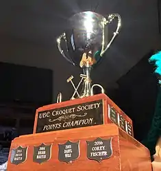 The Wile Cup is a trophy awarded annually to a group of croquet enthusiasts. Formerly the championship trophy for the University of British Columbia's Croquet Society club (Croqsoc), the Wile Cup has since become an annual recreational award. It is named after Croqsoc founder and inaugural club president, Daryl Wile.[1] The tournament which the trophy is played for is also known as the Wile Cup.