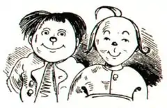 Kleine's private lessons for Busch also were attended by Erich Bachmann, the son of a wealthy Ebergötzen miller. Both became friends, according to Busch the strongest friendship of his childhood. This friendship was echoed in the 1865 story, Max and Moritz. A small pencil portrait by the 14-year-old Busch depicted Bachmann as a chubby, confident boy, and showed similarities with Max. Busch portrayed himself with a "cowlick", in the later "Moritzian" perky style.[17]