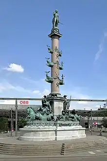 Memorials to Tegetthoff were erected in Maribor, Vienna and Pula. The monument on Vienna's Praterstern, the largest traffic junction of the city, consists of a column 11 meters high (by Karl Hasenauer), topped by a bronze statue of Tegetthoff, some 3.5 meters in height, by Carl Kundmann and was finished in 1886.[6] The memorial at Pula, also by Kundmann, was erected in 1877 and consists of a bronze statue of Tegetthoff, with supporting bronze mythological figures. Pula passed to Italian sovereignty in 1919, and in 1935 the monument was moved to Graz, Austria.
