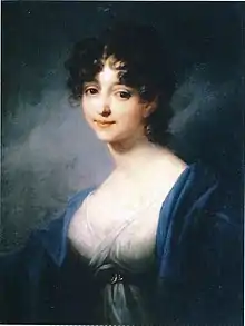 The young duchess was very beautiful, intelligent, eloquent and educated in philosophy and history. She fell in love with Finnish-Swedish general Gustav Armfelt, her mother's lover and her tutor. The secret relationship with a much older and married Armfelt resulted in the birth of an illegitimate daughter named Adelaide Gustava Aspasia (nicknamed Vava), who was born in secrecy in Hamburg on 13 January 1801. The delivery was traumatic, and, due to an incompetent midwife, she lost the ability to have further children. Wilhelmine gave up her child to one of Armfelt's relatives in Finland and never saw her again.[1] Wilhelmine greatly regretted this decision as time went on. To protect her reputation, Armfelt organized a marriage for her with an émigré French nobleman, Prince Louis de Rohan-Guémenée (1768–1836), the son of the Princesse de Guéméné, the original governess of the children of King Louis XVI of France. The marriage did not last and ended in divorce in 1805.
