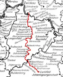 The Wilkau-Haßlau–Carlsfeld narrow-gauge railway (Schmalspurbahn Wilkau-Haßlau–Carlsfeld) was the first, steepest and longest of the narrow-gauge railways in Saxony. The line was around 42 kilometres long, had a track gauge of 750 mm (2 ft 5+12 in) and ran from Wilkau-Haßlau via Kirchberg and Schönheide to Carlsfeld through the Ore Mountains. Only near Rothenkirchen did the line pass through the Vogtland region The railway, opened in 1881 in four stages, was one of the busiest narrow-gauge railways. Services were gradually closed down between 1965 and 1977.