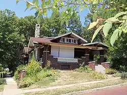 The Radcliff's house is one of the more distinguished examples of the American Craftsman style in Davenport.[2] It reflects the influence of California's prototypes of the style. These influences are found in the houses open plan, the wide eaves, the numerous gables, and the rounded ends of the porch brackets. The house's low profile emphasizes its horizontality. It is also expressed in its plain vergeboards with raked ends on the shallow gabled roofs and dormers. The materials used in the house's construction are also appropriate for the Craftsman style.[2] It features plain wood, wall shingles, smooth brick, glazed gray terracotta, and rubble fieldstone.