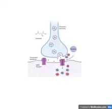 Like AMPA receptors, kainate receptors are tetrameric, transmembrane, ionotropic glutamate receptors on glutamatergic neurons. They have five subunits, divided into two main families: GluK1,2, and GluK5,6,7. An endogenous ligand, either kainic acid or glutamate, binds to the ligand binding site. However, unlike AMPA receptors, external ions also bind to kainate receptors at the ion binding pocket on the extracellular domain. When both the ligand and ion bind, the receptor undergoes a conformational change and the ion channel opens.[10] This allows the flow of positive ions, such as sodium or calcium. The influx of positively charged ions depolarizes, or excites, the neuron (Figure 4).[3] Like AMPA receptors, the permeability to calcium is dependent on the editing of receptor subunit mRNA. The rise and decay times of postsynaptic potentials is much slower in kainate receptors than AMPA receptors.[10]