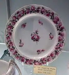 Billingsley was born in Derby in 1758. He was apprenticed at William Duesbury's Royal Crown Derby porcelain works for five years on 26 September 1774. He finally left them in 1796, by which time he was their outstanding painter of flowers, the mainstay of decoration.[2] Billingsley developed a distinctive style of flower painting, which involved using a loaded brush and then removing the colour using a dry brush.[3] He was particularly associated with borders of roses with the prime example of the Prentice Plate. This plate was used in the Derby factories to show trainees the standard that was expected. The name of The Prentice Plate is a shortening of Apprentice Plate.[4]