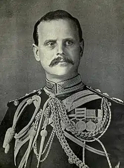 After securing a militia commission in the 4th Battalion Royal Scots Fusiliers in 1883,[5] Birdwood trained at the Royal Military College, Sandhurst, from which he was commissioned early, owing to the Russian war scare of 1885, becoming a lieutenant in the 12th (Prince of Wales's) Royal Lancers on 9 May 1885.[6] He joined his regiment in India and then transferred from the 12th Royal Lancers[7] to the Bengal Staff Corps on 20 December 1886.[8] He subsequently transferred to the 11th Bengal Lancers in 1887, seeing action on the North-West Frontier in 1891. He later became adjutant of the Viceroy's Bodyguard in 1893.[5] He was promoted to captain on 9 May 1896[9] and saw action during the Tirah Campaign in 1897.[5]