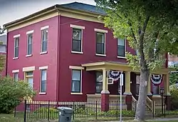 William H. Bostick, who built this house in 1851, is credited with constructing the first brick building in the city.[2] The two-story structure is a vernacular high style Greek Revival. The decorative elements were kept to a minimum. It features limestone lintels, a low-pitched hipped roof, an Arts and Crafts style porch with a balustrade of turned spindles, and a simple entablature across the top. The bricks and stonework have long been painted. It is believed the building served as an early city hall here and as a recruitment center for Civil War regiments.[2] While the house has always been on this lot, it was moved to its current location further back on the lot in 1908. The present porch was added at that time.