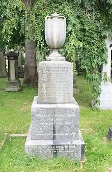 Brodie died at his home at 9 Cambridge Street,[3] Edinburgh, on 30 October 1881. He is buried with his wife and daughter in the Dean Cemetery under a simple granite monument surmounted by an urn, unlike his far grander monuments to others around him. The grave lies on the north side of the main east-west path, west of the large Beattie obelisk. The urn bears a carving of a caterpillar being reborn as a butterfly, a Greek symbol indicating a belief in reincarnation or a second life beyond death.