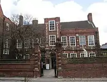 Built for John, Lord Bellasis, the Governor of Hull. The front is of five bays and two storeys, divided by giant Doric pilasters. Flat projecting surrounds and strange hoods to the doors and to the ground-floor windows. There is a large studded cornice. The building originally had Dutch gables. The Foundation was for four poor widows.[7]