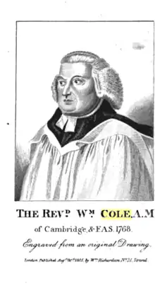 This article incorporates text from a publication now in the public domain: Cooper, Thompson (1887). "Cole, William (1714–1782)". In Stephen, Leslie (ed.). Dictionary of National Biography. Vol. 11. London: Smith, Elder & Co. The entry cites: