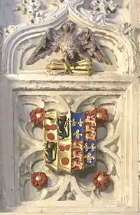 Three sculpted heraldic shields of arms exist above the effigy, showing the arms of Courtenay, Courtenay impaling the royal arms of England and the royal arms of England. Later authorities[11] have suggested, on the basis of the monument's heraldry, the effigy to be the wife of Thomas Courtenay, 5th/13th Earl of Devon (1414–1458), namely Lady Margaret Beaufort (c. 1409 – 1449), daughter of John Beaufort, 1st Marquess of Somerset, 1st Marquess of Dorset (1373–1410), KG (later only 1st Earl of Somerset) (the first of the four illegitimate children of John of Gaunt, 1st Duke of Lancaster (4th son of King Edward III), and his mistress Katherine Swynford, later his wife) by his wife Margaret Holland. The basis of this re-attribution is the belief that the "royal arms" shown are not the arms of King Edward IV, but those of Beaufort. The arms of Beaufort are the royal arms of England differenced within a bordure compony argent and azure.[12]
