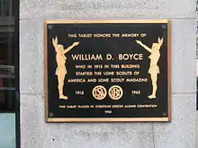 Boyce was recognized with the Silver Buffalo Award in 1926, the first year it was awarded, for his efforts in starting the BSA. He was the third recipient, after Baden-Powell and the Unknown Scout.[77] During the BSA's 50th anniversary in 1960, 15,000 Scouts and several of Boyce's descendants gathered in Ottawa for a Boyce Memorial weekend. Illinois governor William Stratton delivered the key address and Bridge Street was renamed Boyce Memorial Drive. In 1985, about 2,500 Scouts attended a 75th anniversary pilgrimage in Ottawa, attended by his last surviving child, Virginia, and the Union League of Chicago named Boyce its first Hall of Fame member. Boyce had been a member from 1891 until he died.[78] On December 6, 1997, a Scouting museum opened in Ottawa.[79] The W. D. Boyce Council of the BSA is named in his honor.[80] A Pennsylvania State Historical Marker located on Boyce Campus of Community College of Allegheny County in Monroeville, Pennsylvania, recognizes his achievements to Scouting.[81] Not far from the marker is a county park, Boyce Park, that was named for him. A medallion of Boyce is near the White House as part of The Extra Mile – Points of Light Volunteer Pathway.[82] In 2005, the BSA introduced the William D. Boyce New Unit Organization Award, presented to the organizer of any new Scouting unit.[83]