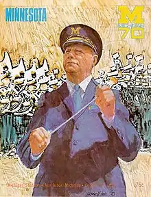 In 1935 Revelli was hired by the University of Michigan as director of bands.[1] Revelli almost decided against applying for the Michigan job because the pay was significantly lower than what he was earning in Hobart, but he did apply for and later accept the job,[2] a position he held for 36 years. Revelli retired in 1972 and was director emeritus until his death in 1994,[1] Under his direction, the Michigan Marching Band was acclaimed for its musical precision, intricate formations and high-stepping style. The Marching Band under Revelli was “the first to score original music to band shows, to synchronize music and movement, to use an announcer, to do a post-game show, and the first to host a high school Band Day.”[10]