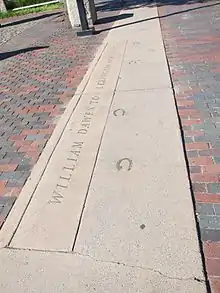 Dawes's ride is commemorated on a traffic island in Cambridge, Massachusetts, heavily travelled by pedestrians, at the intersection of Garden Street and Massachusetts Avenue in Harvard Square, and known as Dawes Island. Dawes's passage through the area is represented by bronze horseshoes embedded in the sidewalk, as hoofprints, accompanied by an inscription giving his name and the date (inaccurately stated as April 19, 1775), and by historical displays.[12][13]